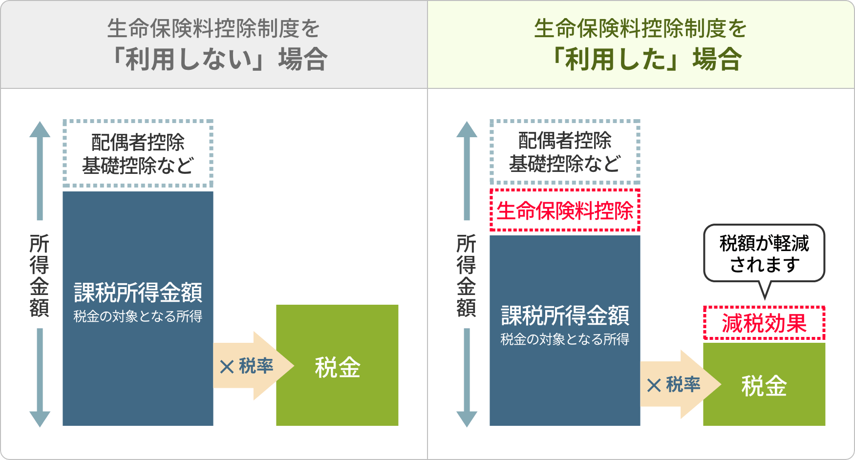 その年の1月から12月に払い込んだ生命保険料に応じて、一定の金額が契約者(保険料負担者)のその年の所得から差し引かれる制度です。税率を掛ける前の所得が低くなることにより所得税、住民税の負担が軽くなります。