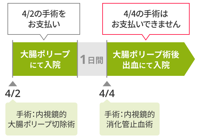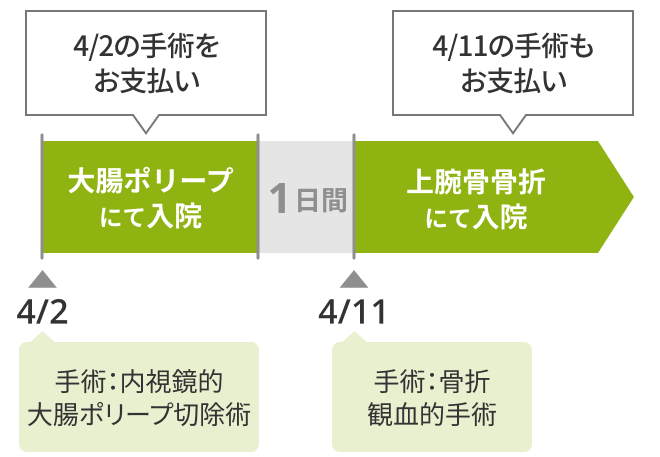 病気やケガで1泊2日以上の入院中に手術を受け、その後、同一の病気やケガを原因として1回の入院中(※事例5をご覧ください)に再手術を受けた場合
