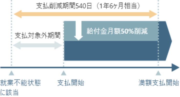 支払削減期間中(就業不能状態に該当した日から540日間)は、設定した就業不能給付金月額の50%相当額をお支払いします。