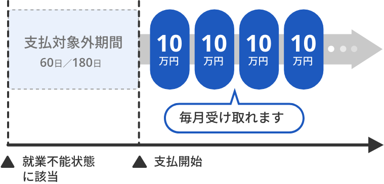 所定の就業不能状態が支払対象外期間をこえて継続したときに毎月就業不能給付金を受け取れます。